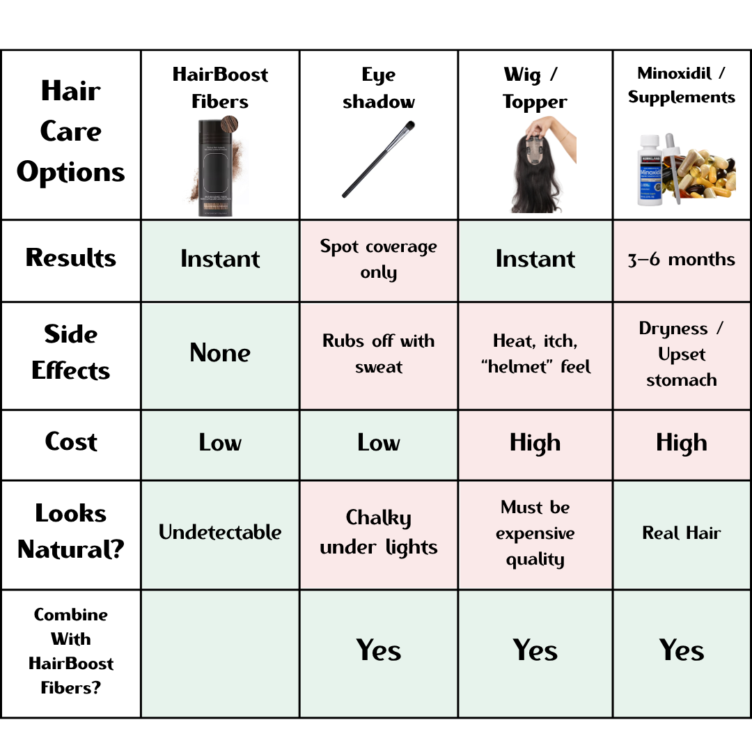 HairBoost Hair Building Fibers, made of colored keratin protein, blend undetectably with existing hair strands to instantly create the appearance of naturally thick, full hair